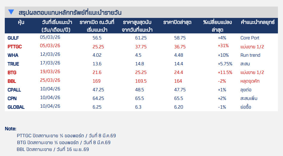 Action Plan:เมื่อพี่ใหญ่ DELTA พักฐาน เงินจะไหลไปสู่กลุ่มอื่น ๆ เช่น กลุ่มค้าปลีก (CPALL, CPN, GLOBAL): รับผลบวกจากการบริโภคช่วงสงกรานต์ที่คึกคักและลุ้นงบ Q1/69 ที่น่าจะออกมาดี ขณะที่กลุ่ม Leader sectors เช่น GULF, TRUE และ WHA ยังไปได้สวย