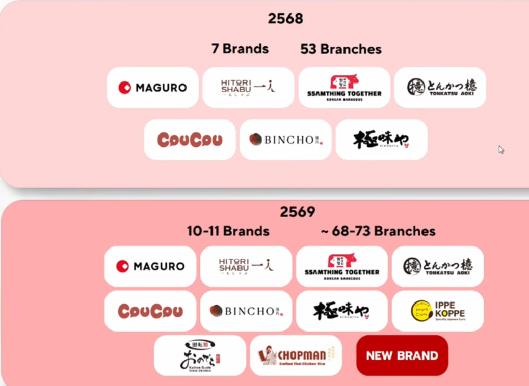 ปัจจุบันบริษัทมี 7 แบรนด์ รวม 53 สาขา แต่ภายในสิ้นปี 2569 จะเพิ่มเป็น 10-11 แบรนด์ โดยมีไฮไลท์สำคัญคือ