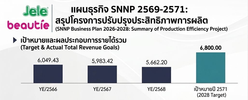 นายศุภโชค บำรุงพันธ์ ประธานเจ้าหน้าที่บริหารสายงานบัญชีและการเงิน บริษัทศรีนานาพร มาร์เก็ตติ้ง (SNNP) เปิดเผยถึงกลยุทธ์หัวหอกสำคัญอย่าง โครงการ “Jump+” ภายใต้สายการผลิต เจเล่ บิวตี้ หรือ Jele Beautie ซึ่งถือเป็นการปรับปรุงประสิทธิภาพการผลิตครั้งใหญ่ เนื่องจากไลน์การผลิตเดิมใช้งานมานานเฉลี่ยกว่า 13 ปี จนเกิดข้อจำกัด ทั้งต้นทุนแรงงานที่สูงและความเสี่ยงเรื่องคุณภาพสินค้าที่ไม่คงที่ โดยตั้งเป้ารายได้ปี 2571 ไว้ที่ 6,800 ล้านบาท เพิ่มขึ้น 20.1% จากปี 2568