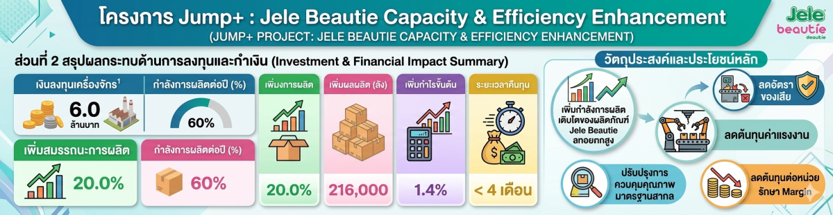 บริษัทจึงตัดสินใจทุ่มงบลงทุน 6 ล้านบาท นำร่องติดตั้งระบบอัตโนมัติ (Automation) ในไลน์การผลิตบรรจุภัณฑ์ 1 ไลน์ ในไลน์การผลิตบรรจุภัณฑ์ของจีเล่ (Jele) จากทั้งหมด 4 ไลน์ ตั้งเป้าเพิ่มกำลังการผลิต ขึ้นอีก 20% หรือประมาณ 216,000 คาร์ตันต่อปี เพื่อรองรับการเติบโตของกลุ่มเจเล่ ลดอัตราของเสีย (Waste) ในกระบวนการผลิตอย่างมีนัยสำคัญ คาดว่าจะช่วยดันอัตรากำไรขั้นต้น (GP Margin) ให้เพิ่มขึ้นได้ประมาณ 1.4% มั่นใจสามารถคืนทุน ได้ภายในระยะเวลาไม่เกิน 4 เดือน