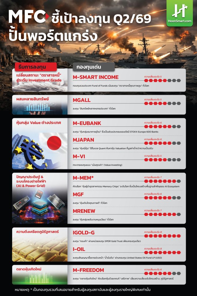 HoonSmart.com>>บลจ.เอ็มเอฟซี (MFC) เปิดธีมลงทุนไตรมาส 2/69 สร้างพอร์ตเติบโต กระจายลงทุนหลายสินทรัพย์ทั่วโลก เน้นตราสารหนี้คุณภาพดี ธีมหุ้นกลุ่ม Value ชูหุ้นแบงก์ยุโรป-หุ้นญี่ปุ่น ธีม AI & Power Grid สินทรัพย์ทางเลือก ทองคำ-น้ำมัน ส่วน “หุ้นไทย” คาดดัชนีแกว่ง Sideways