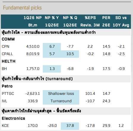 ขณะเดียวกัน การเข้าสู่ช่วงประกาศผลประกอบการไตรมาส 1Q69 ซึ่งยังได้รับผลกระทบจากต้นทุนพลังงานในระดับจำกัด ช่วยหนุน risk-on sentiment และทำให้บรรยากาศการลงทุนในระยะสั้นยังคงเป็นบวก