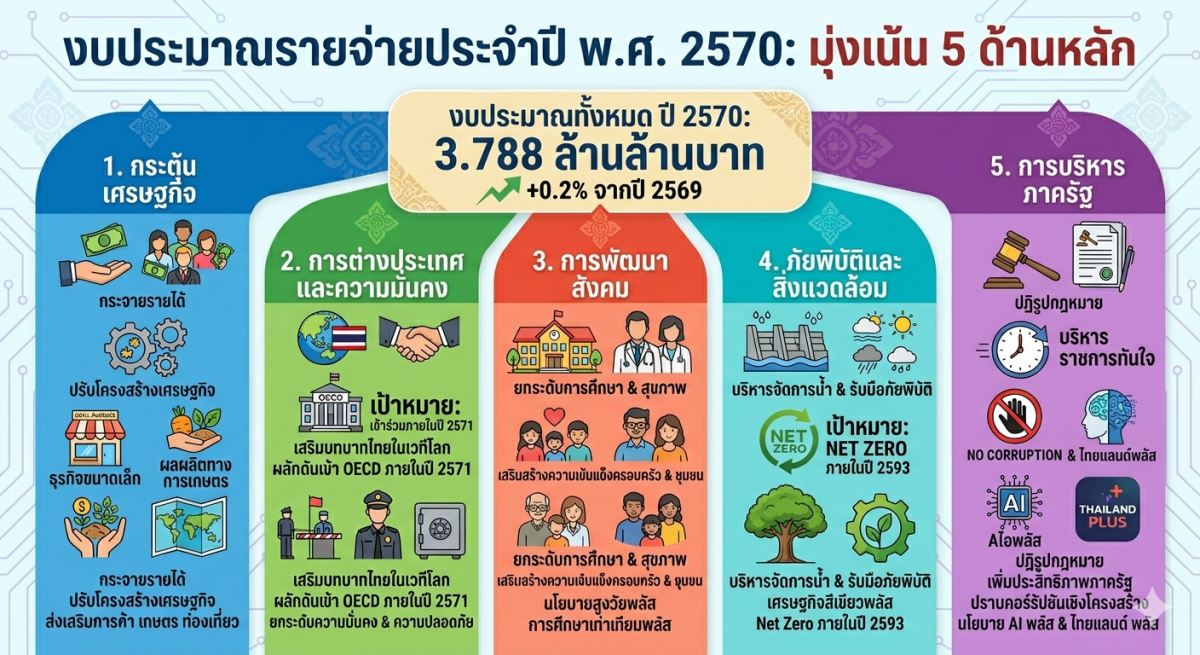 นายกรัฐมนตรี ระบุว่า การจัดทำงบประมาณปี 2570 จะต้อง “ตรงเป้า แม่นยำ” และตอบโจทย์นโยบาย “10 พลัส” เพื่อพาประเทศก้าวผ่านวิกฤต ควบคู่กับการวางรากฐานการพัฒนาอย่างยั่งยืน และเร่งหลุดพ้นจากกับดักประเทศรายได้ปานกลาง โดยรัฐบาลกำหนดกรอบนโยบายสำคัญ 5 ด้าน ได้แก่