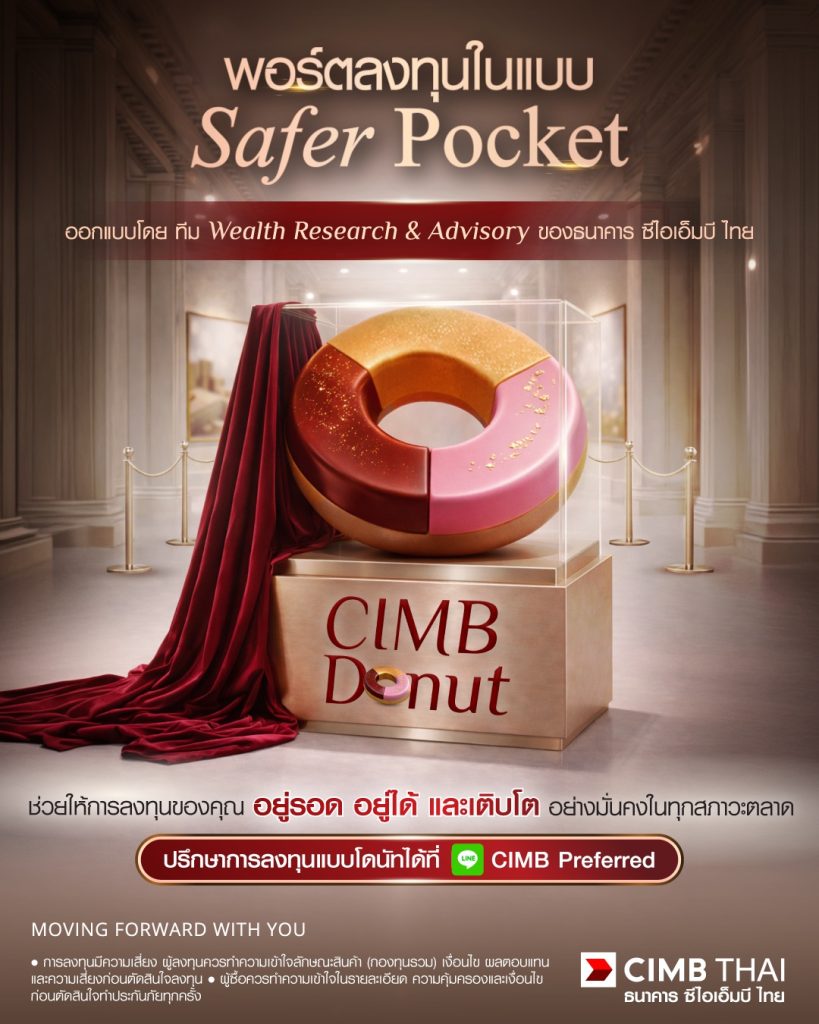 สำหรับนักลงทุนที่สนใจลงทุนกองทุนรวมแต่ไม่มีเวลาจัดสรรพอร์ต ทีมผู้เชี่ยวชาญ Wealth Research & Advisory ธนาคาร ซีไอเอ็มบี ไทย ได้ออกแบบ ‘CIMB Donut’ พอร์ตลงทุนกระจายความเสี่ยง ที่ปรับสัดส่วนการลงทุนให้เหมาะสมกับสภาวะตลาดในแต่ละช่วงเวลา เพื่อรวมเป็นพอร์ตการลงทุนสำเร็จรูปที่มีความสมดุล เปรียบเสมือน ‘โดนัท 1 ชิ้น’ ให้ลูกค้าพร้อมลงทุนได้อย่างสะดวกโดยไม่ต้องติดตามหรือวิเคราะห์ตลาดด้วยตัวเอง และมีโดนัทให้ลูกค้าเลือก 3 รูปแบบ เหมาะกับระดับความเสี่ยงเฉพาะบุคคลและเป้าหมายผลตอบแทนที่แตกต่างกัน ครอบคลุมกลุ่มที่คาดหวังผลตอบแทนประมาณ 2–3% 4–6% และ 7–9% เน้นการเติบโตอย่างยั่งยืน ผ่านการคัดสรรกองทุนจากเครือข่าย Open Architecture ของบริษัทจัดการกองทุนชั้นนำกว่า 13 แห่ง