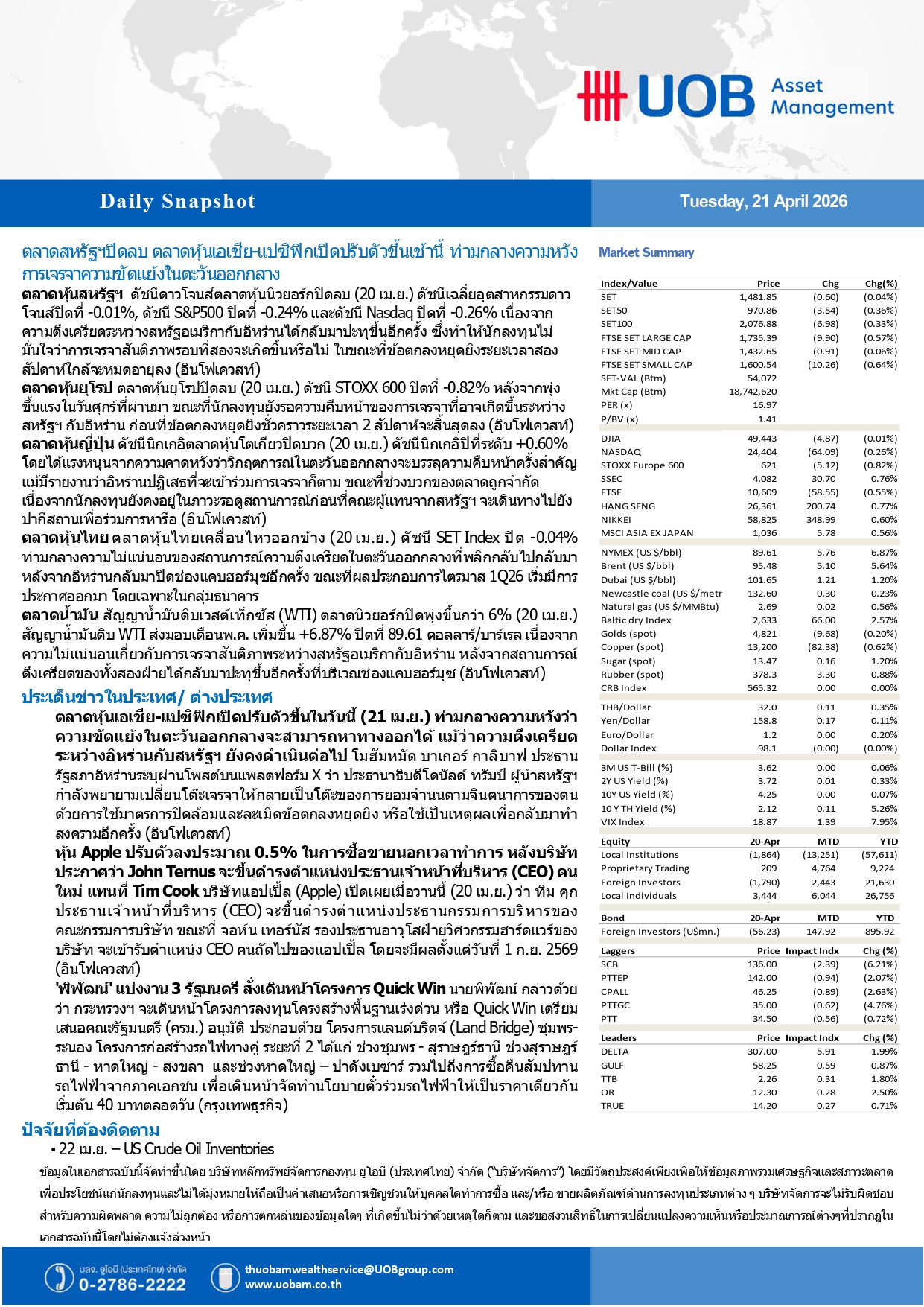 UOBAM : ตลาดสหรัฐฯปิดลบ “เอเชีย-แปซิฟิก” เปิดบวกเช้านี้ หวังการเจรจาความขัดแย้งในตะวันออกกลาง 21/04/2026 08:48009Breaking News, Fund Manager Facebook iconFacebookTwitter iconTwitterLINE iconLine