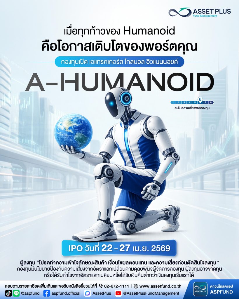 บลจ.แอสเซท พลัส เปิดเสนอขายกองทุนเปิด เอแทรคเกอร์ส โกลบอล ฮิวแมนนอยด์ (A-HUMANOID) มีกำหนดเปิดเสนอขายครั้งแรก (IPO) ระหว่างวันที่ 22–27 เมษายน 2569 ทั้งนี้ กองทุนมีลักษณะเป็น Feeder Fund ที่ลงทุนในต่างประเทศ โดยมีการป้องกันความเสี่ยงจากอัตราแลกเปลี่ยนตามดุลยพินิจของผู้จัดการกองทุน และมีระดับความเสี่ยงอยู่ที่ระดับ 6