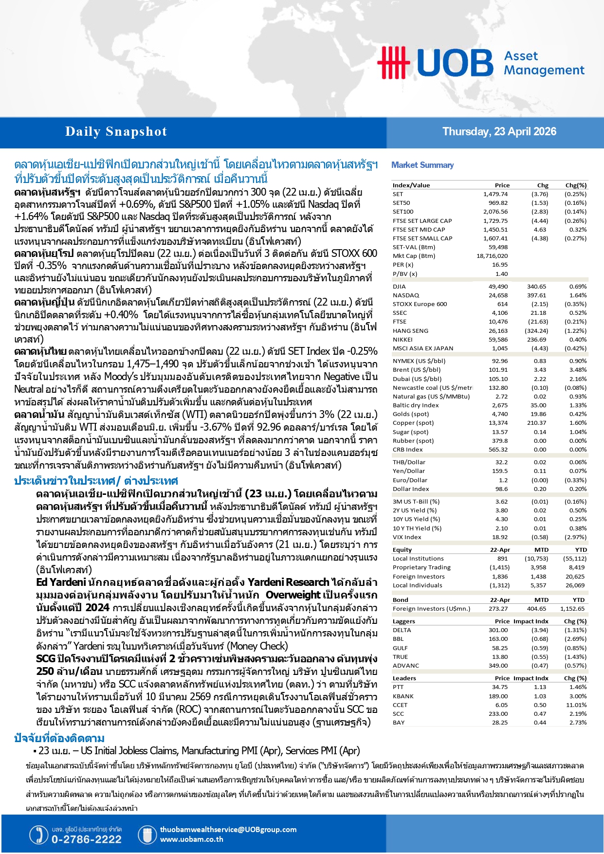 UOBAM : ตลาดหุ้นเอเชีย-แปซิฟิกเปิดบวกส่วนใหญ่เช้านี้ ตามตลาดหุ้นสหรัฐฯ ปิดที่ระดับสูงสุดเป็นประวัติการณ์ 23/04/2026 09:08009Breaking News, Fund Manager Facebook iconFacebookTwitter iconTwitterLINE iconLine