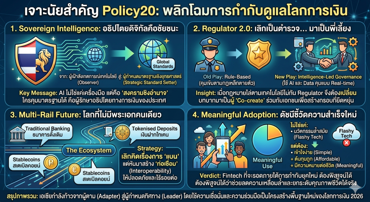 ประเด็นสำคัญจากเวที Policy20 คือ อนาคตของระบบการเงินในเอเชียจะไม่ได้ขับเคลื่อนด้วยนวัตกรรมเพียงอย่างเดียว แต่ต้องอาศัยความเชื่อมั่น ความร่วมมือ และโครงสร้างพื้นฐานดิจิทัลอัจฉริยะควบคู่กันไป