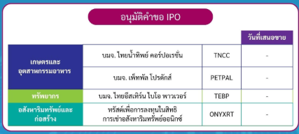 สำนักงานคณะกรรมการกำกับหลักทรัพย์และตลาดหลักทรัพย์ (ก.ล.ต.) รายงานความคืบหน้าล่าสุดถึงบริษัทที่ได้รับอนุมัติคำขอเสนอขายหุ้นสามัญเพิ่มทุนให้แก่ประชาชนทั่วไปเป็นครั้งแรก (IPO) แล้วจำนวน 4 บริษัท ประกอบด้วยกลุ่มเกษตรและอุตสาหกรรมอาหาร ได้แก่ บริษัทไทยน้ำทิพย์ คอร์ปอเรชั่น (TNCC) และ บริษัท เพ็ทพัล โปรดักส์ (PETPAL), กลุ่มทรัพยากร คือ บริษัทไทยอีสเทิร์น ไบโอ พาวเวอร์ (TEBP) และกลุ่มอสังหาริมทรัพย์และก่อสร้าง ได้แก่ ทรัสต์เพื่อการลงทุนในสิทธิการเช่าอสังหาริมทรัพย์โอนิกซ์ (ONYXRT)
