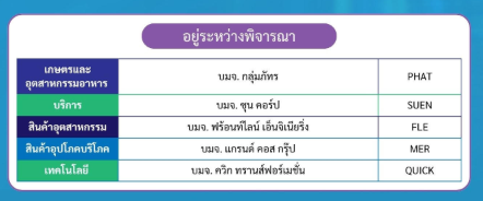 ขณะนี้ มีหุ้นที่อยู่ระหว่างการพิจารณา 5 บริษัท ได้แก่ บริษัทกลุ่มภัทร (PHAT), บริษัทซุน คอร์ป (SUEN), บริษัทฟร้อนท์ไลน์ เอ็นจิเนียริ่ง (FLE), บริษัทแกรนด์ คอส กรุ๊ป (MER) และ บริษัทควิก ทรานส์ฟอร์เมชั่น (QUICK)