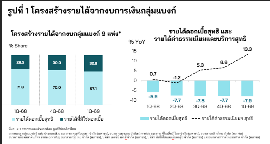 ค่าธรรมเนียมและบริการสุทธิอาจเผชิญแรงกดดันมากขึ้นตั้งแต่ช่วงไตรมาสที่ 2/2569 เนื่องจากความต้องการใช้บริการทางการเงินบางประเภทอาจชะลอลงตามกิจกรรมทางเศรษฐกิจที่ซบเซา ขณะเดียวกัน ความผันผวนของตลาดการลงทุนอาจกระทบต่อรายได้ค่าฟีจากธุรกิจบริหารความมั่งคั่ง การขายกองทุนรวม และผลิตภัณฑ์การลงทุนอื่น ๆ ซึ่งมักขึ้นอยู่กับบรรยากาศการลงทุนและความเชื่อมั่นของลูกค้า นอกจากนี้ รายได้จากค่าธรรมเนียมบางรายการอาจชะลอลงตามหลักเกณฑ์การกำหนดมาตรฐานค่าบริการและการให้บริการของธปท. ซึ่งมีการกำหนดมาตรฐานและเพดานใหม่สำหรับค่าธรรมเนียมที่เกี่ยวข้องกับบัญชีเงินฝาก ค่าบริการที่เกี่ยวข้องกับบัตรอิเล็กทรอนิกส์ ธุรกรรมชำระเงิน รวมถึงจำกัดค่าธรรมเนียมที่เกี่ยวกับสินเชื่อ SMEs เพื่อให้สะท้อนต้นทุนจริง และห้ามชดเชยด้วยการตั้งค่าธรรมเนียมใหม่หรือปรับดอกเบี้ยทดแทน