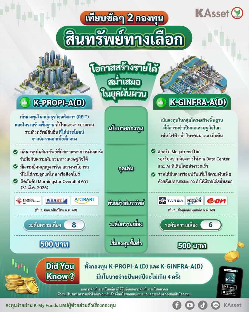 HoonSmart.com>>บลจ.กสิกรไทย (KAsset) ชี้ท่ามกลางความไม่แน่นอน แนะกลยุทธ์กระจายลงทุน “สินทรัพย์ทางเลือก” ช่วยเพิ่มเสถียรภาพพอร์ตลงทุน สร้างกระแสเงินสดรับสม่ำเสมอ ครอบคลุมกลุ่มธุรกิจอสังหาฯ -โครงสร้างพื้นฐานทั่วโลก ผ่าน 2 กองทุนเด่น “K-PROPI-A(D) , K-GINFRA-A(D)”