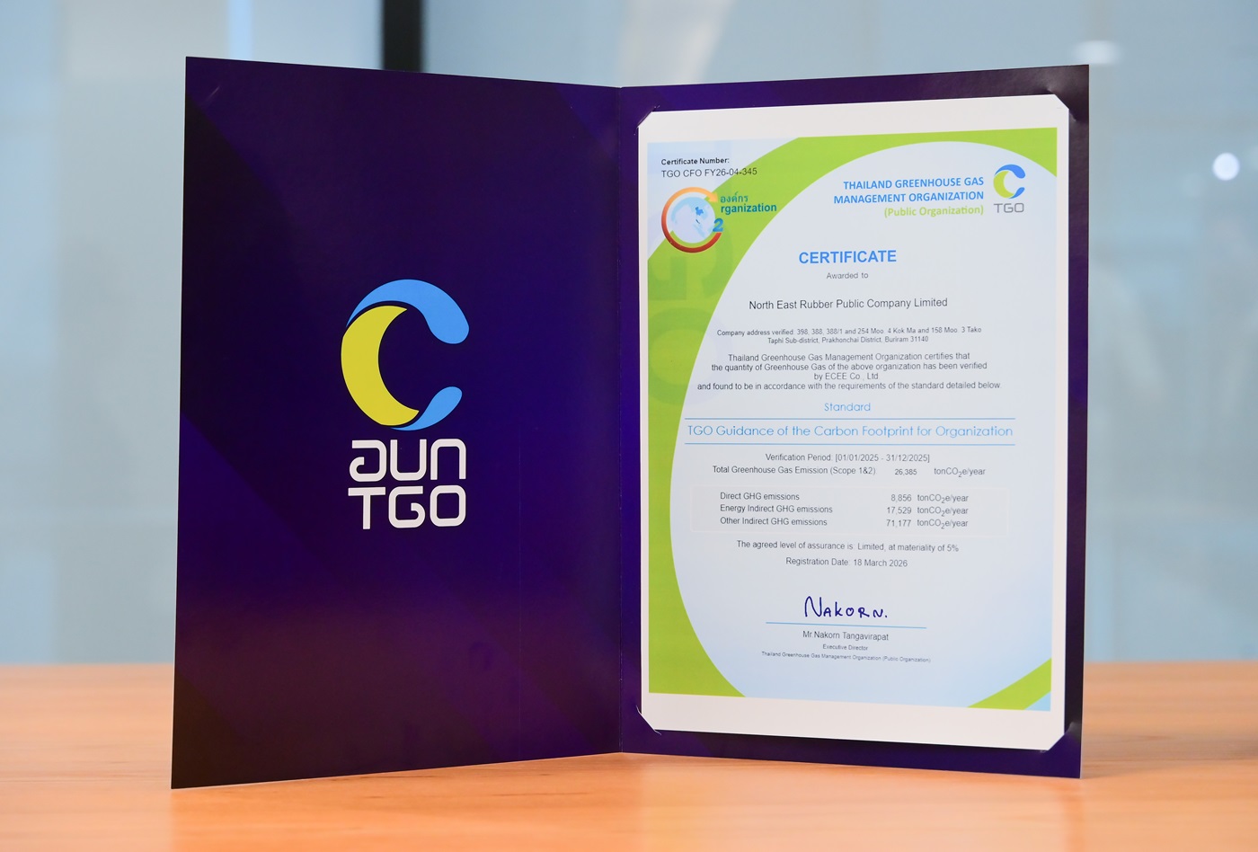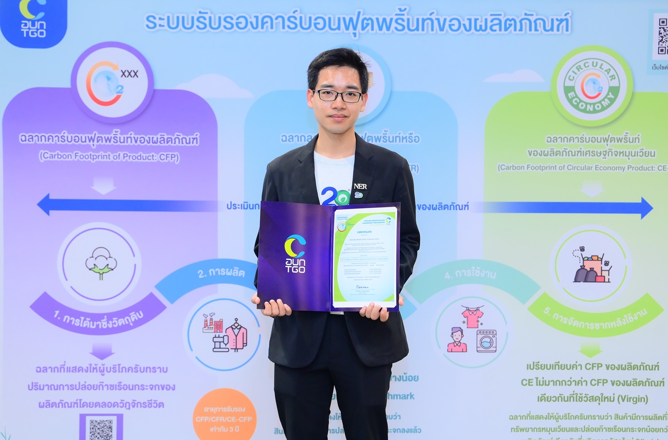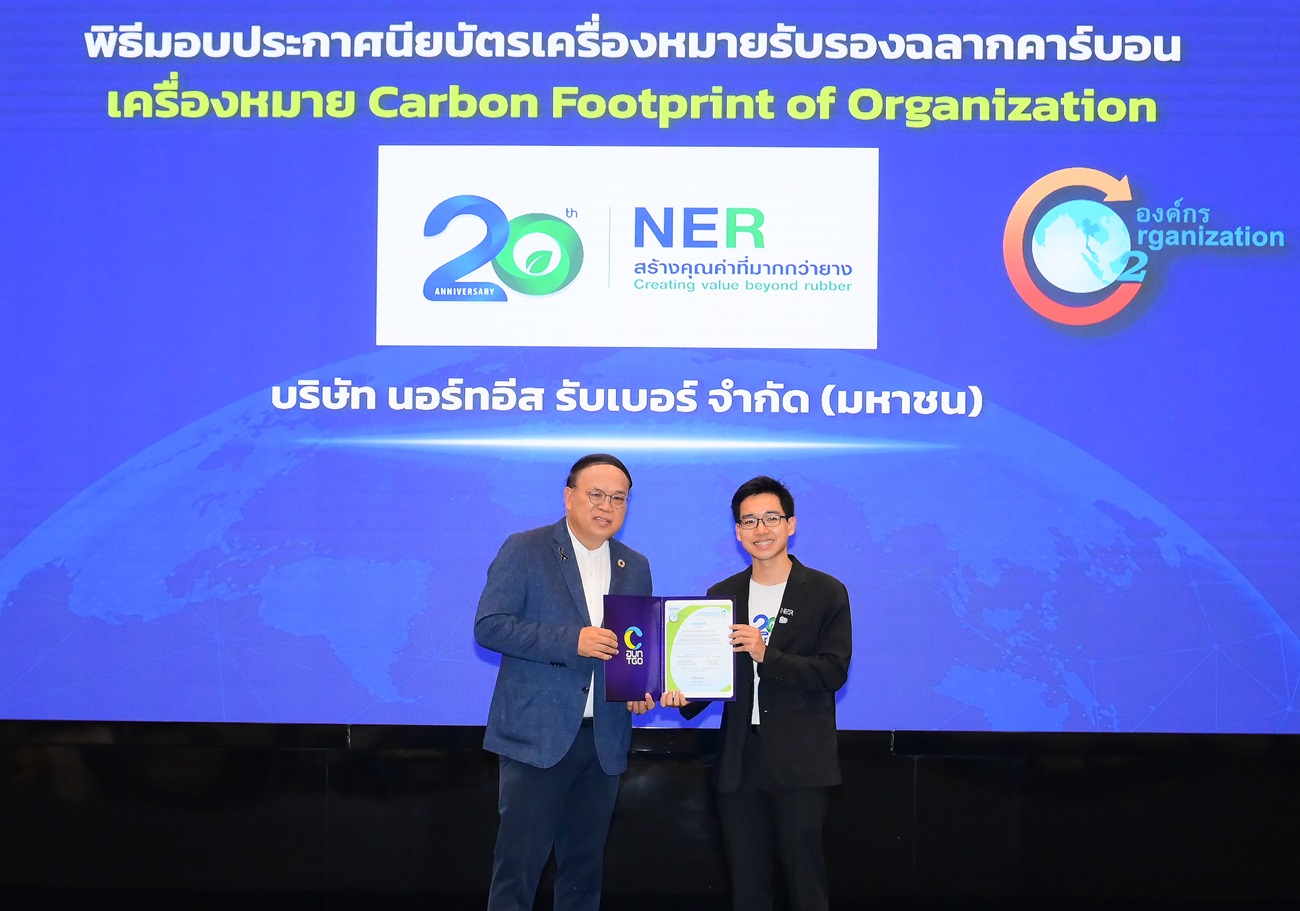 นายจิรายุส จึงธนสมบูรณ์ ผู้ช่วยประธานเจ้าหน้าที่บริ หาร บริษัท นอร์ทอีส รับเบอร์ (NER) ผู้ผลิตและจำหน่ายผลิตภัณฑ์ ยางสำหรับอุตสาหกรรมยานยนต์ทั้ งในและต่างประเทศ เป็นตัวแทนเข้ารับเกียรติบั ตรเครื่องหมายคาร์บอนฟุตพริ้นท์ ขององค์กร