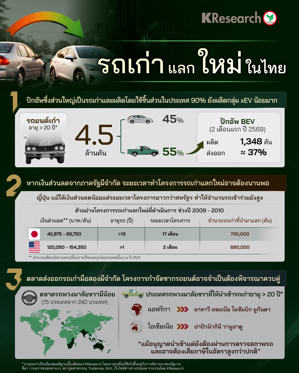 หากพิจารณารถเก่าในประเทศที่ปล่อยมลพิษสูงอย่างกลุ่มอายุมากกว่า 20 ปี ที่มีมากกว่า 4.5 ล้านคัน ซึ่งส่วนใหญ่เป็นรถกระบะและผลิตด้วยชิ้นส่วนในประเทศกว่า 90% ขณะที่การผลิตรถยนต์ไฟฟ้า (xEV) ในประเทศยังอยู่ในระดับต่ำ โดยในช่วง 2 เดือนแรกของปี 2569 ไทยผลิตรถกระบะไฟฟ้า (BEV) ได้เพียง 1,348 คัน และส่งออกประมาณ 37% ของจำนวนดังกล่าว หากสนับสนุนให้มีการแลกรถปิกอัพ การหาแนวทางพัฒนาร่วมกันเพิ่มเติมกับภาคเอกชนอาจมีความจำเป็น