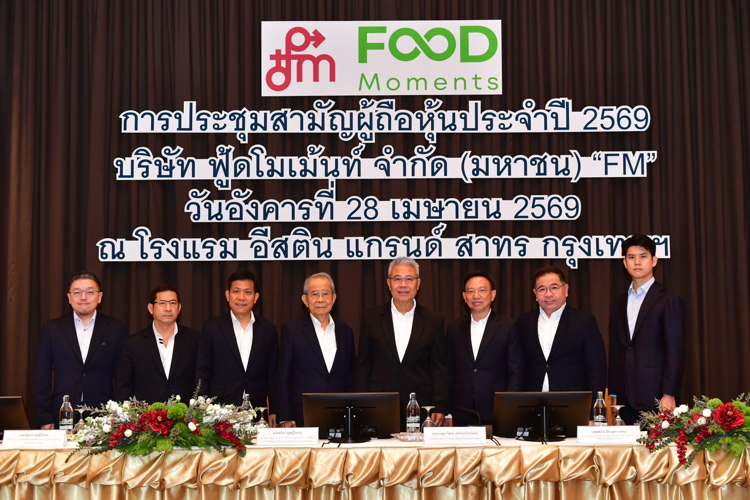 เจษฎาวัฒน์ เพรียบจริยวัฒน์ (ที่ 5 จากซ้าย) ประธานกรรมการ , สนิท ดุษฎีโหนด (ที่ 4 จากซ้าย) ประธานกรรมการบริหาร , ณัฐพล ดุษฎีโหนด (ที่ 3 จากซ้าย) ประธานเจ้าหน้าที่บริหาร , เชฏฐพล ดุษฎีโหนด (ที่ 2 จากซ้าย) รองประธานเจ้าหน้าที่บริหาร และ สุเมธ มาสิลีรังสี (ซ้ายสุด) ประธานเจ้าหน้าที่ฝ่ายการเงิน พร้อมด้วยคณะกรรมการ บริษัท ฟู้ดโมเม้นท์  ( FM)  ร่วมประชุมสามัญผู้ถือหุ้นประจำปี 2569 (AGM)