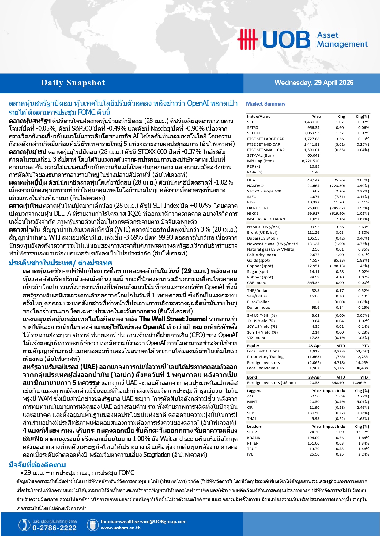 UOBAM : ตลาดหุ้นสหรัฐฯปิดลบ หุ้นเทคร่วง หลังข่าว OpenAI พลาดเป้ารายได้ ติดตามประชุม FOMC คืนนี้ 29/04/2026 09:10009Breaking News, Fund ManagerUOBAM HoonSmart.com>>UOBAM Daily Snapshot: ตลาดหุ้นสหรัฐฯปิดลบ หุ้นเทคโนโลยีปรับตัวลดลง หลังข่าวว่า OpenAI พลาดเป้ารายได้ ติดตามการประชุม FOMC คืนนี้ Facebook iconFacebookTwitter iconTwitterLINE iconLine