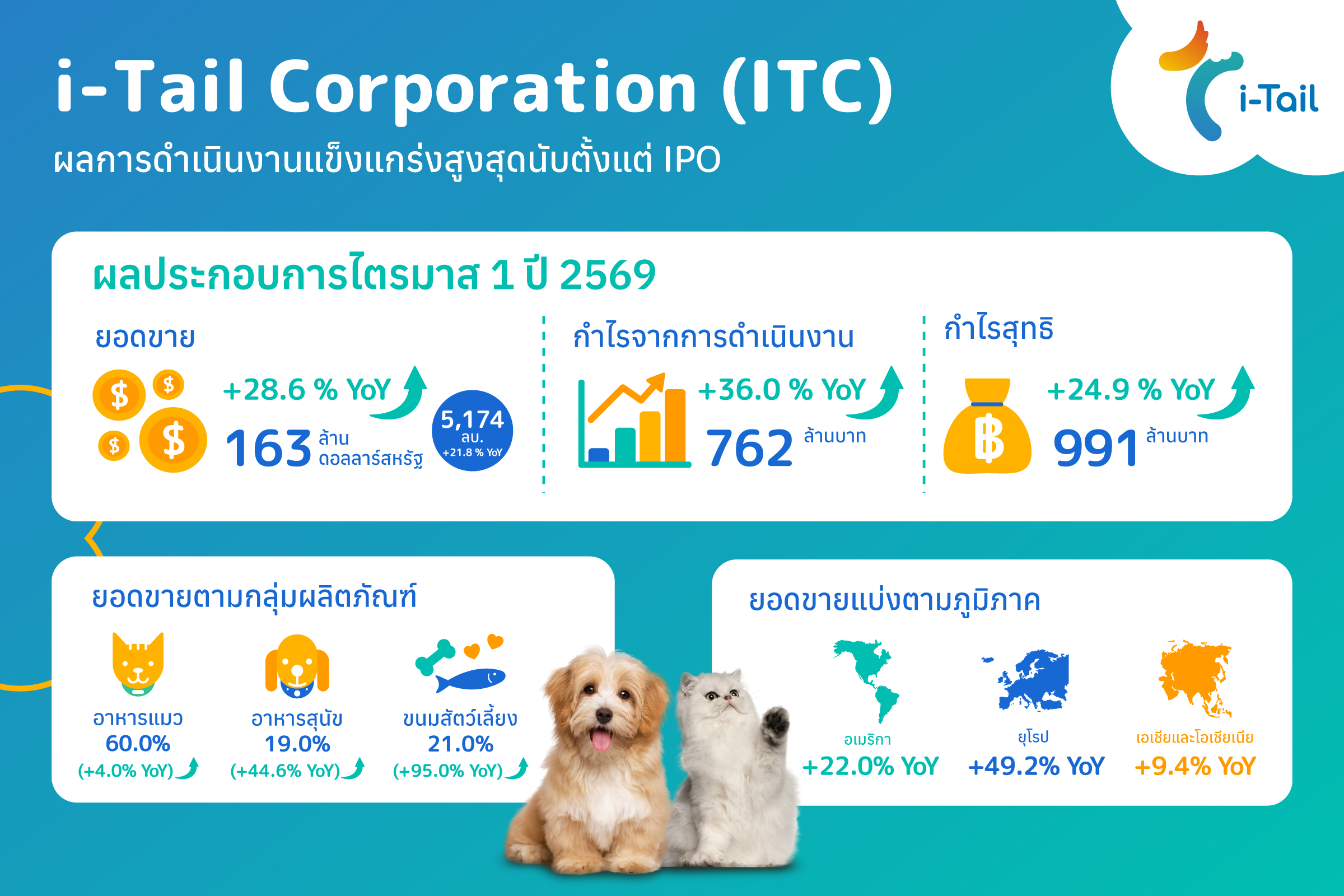 บริษัท ไอ เทล คอร์ปอเรชั่น (ITC) ผู้นำระดับโลกในอุตสาหกรรมอาหารสัตว์เลี้ยง รายงานผลการดำเนินงานงวดไตรมาสที่ 1/2569 มีกำไร สุทธิ 871.27 ล้านบาท กำไรหุ้นละ 0.29039 บาท เพิ่มขึ้น 28.7% จากช่วงเดียวกันของปีก่อนที่มีกำไรสุทธิ 676.87 ล้านบาท หรือ 0.22561 บาทต่อหุ้น (YoY) และเติบโต 9.9% จากไตรมาส 4/68 ที่มีกำไรสุทธิ 793 ล้านบาท(QoQ)
