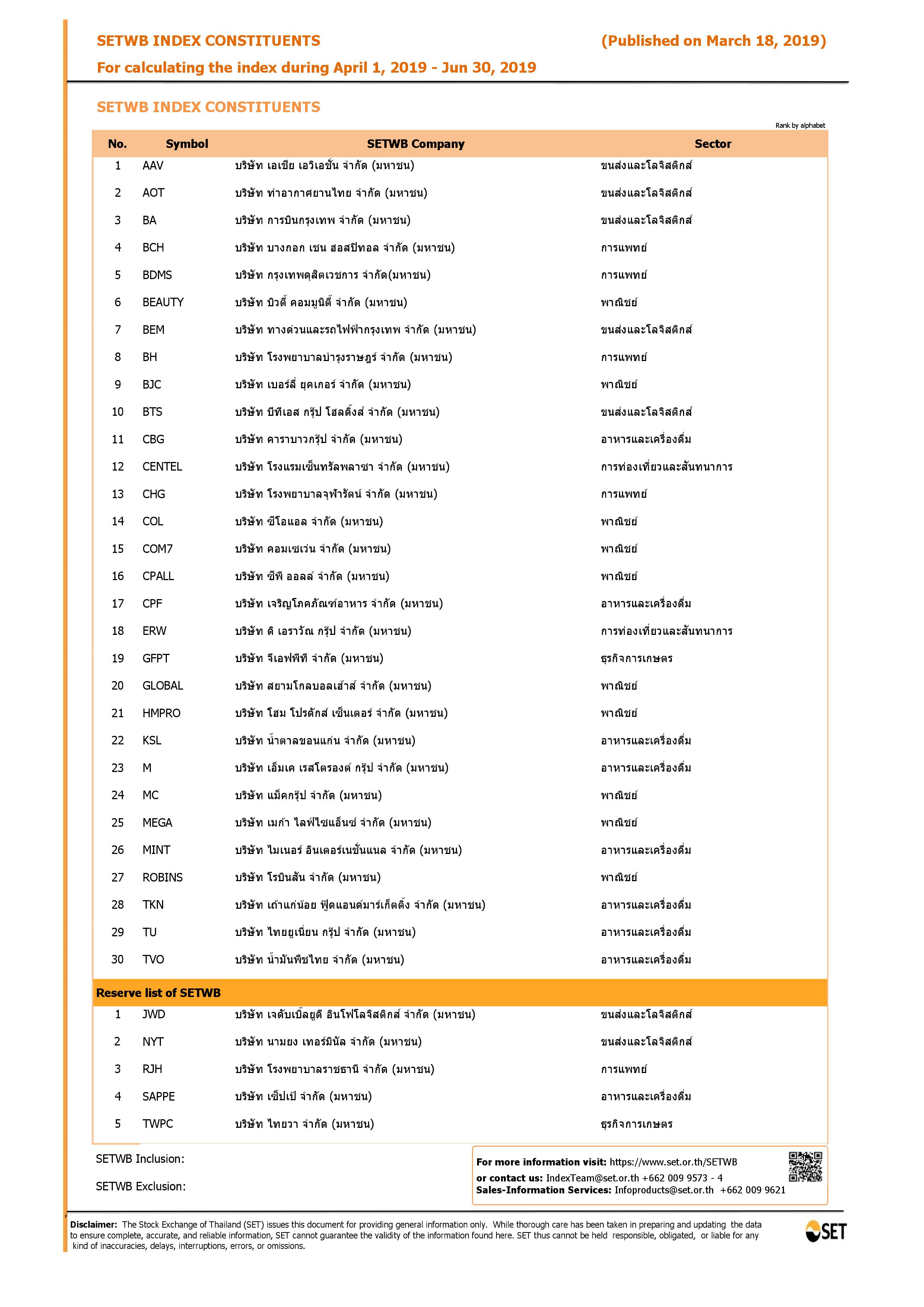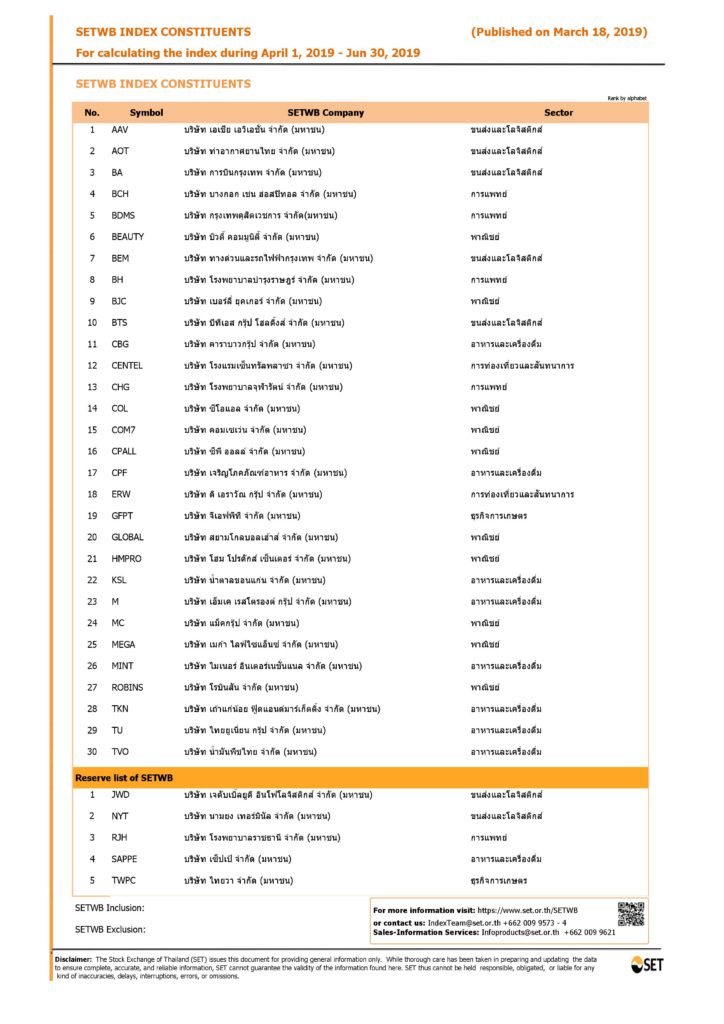 ทั้งนี้ หลักทรัพย์ที่มีมูลค่าตามราคาตลาด (Market Capitalization) สูงสุด 30 ลำดับแรกที่ผ่านเกณฑ์การคัดเลือกจะถูกนำเข้าเป็นองค์ประกอบของดัชนี SETWB และมีหลักทรัพย์สำรอง 5 ลำดับ โดยจะจำกัดน้ำหนักของแต่ละหลักทรัพย์ไม่ให้เกิน 10% ในทุกไตรมาส รายชื่อหลักทรัพย์สำหรับคำนวณในดัชนี SETWB ครั้งแรกจะใช้ข้อมูลตั้งแต่ 1 ธ.ค. 2560 ถึง 30 พ.ย. 2561 เริ่มเผยแพร่ดัชนีในวันที่ 1 เม.ย. 2562 และทบทวนรายชื่อหลักทรัพย์ที่เป็นองค์ประกอบของดัชนีทุก 6 เดือน (มิ.ย. และ ธ.ค.)