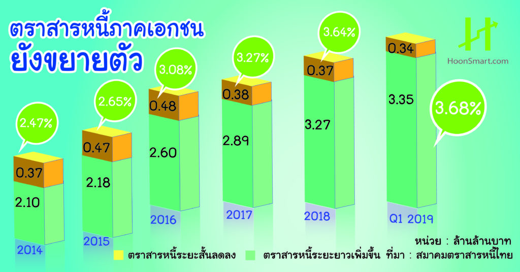 HoonSmart.com>>สมาคมตลาดตราสารหนี้ไทยเผยไตรมาส 1/2562 นักลงทุนต่างชาติขายกว่า 4.2 หมื่นล้าน เน้นทำกำไรพันธบัตรรัฐบาลระยะสั้น ผลตอบแทนสู้เพื่อนบ้านไม่ได้ ซื้อระยะยาว เพิ่มอายุเฉลี่ยเป็น 8.46 ปี คาดดอกเบี้ยนโยบายไม่เปลี่ยนแปลงจนถึงสิ้นปี รอเงินเฟ้อ-การลงทุนเอกชนมหาศาลกระตุ้น ยืนเป้าหมายเอกชนออกหุ้นกู้ระยะยาวปีนี้ไว้ที่ 7.5-8.5 แสนล้านบาท ครบอายุ 5.6 แสนล้านบาท ออกใหม่รีไฟแนนซ์ 60% ต้องการเงินเพื่อดีลควบรวมกิจการ