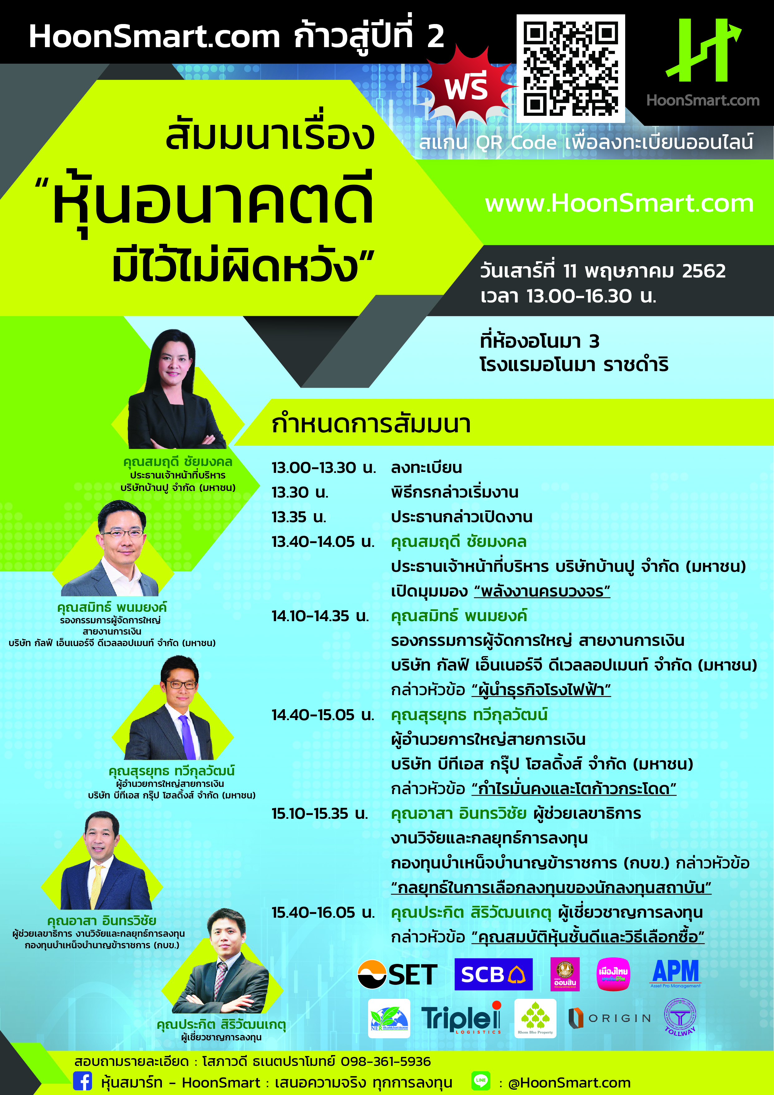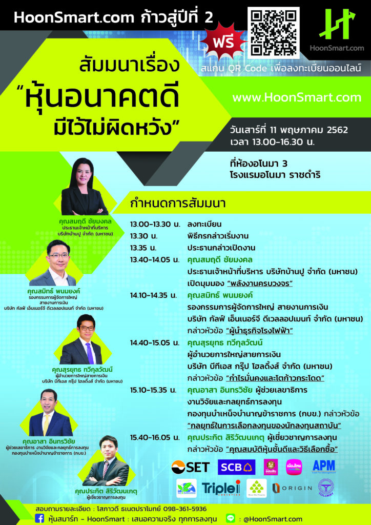 ในโอกาสก้าวสู่ปีที่ 2 “สำนักข่าว HoonSmart.com” จัดสัมมนา หัวข้อ “หุ้นอนาคตดี มีไว้ไม่ผิดหวัง” วันเสาร์ที่ 11 พฤษภาคม 2562 เวลา 13.00 – 16.30 น. ณ ห้องอโนมา 3 โรงแรมอโนมา ราชดำริ