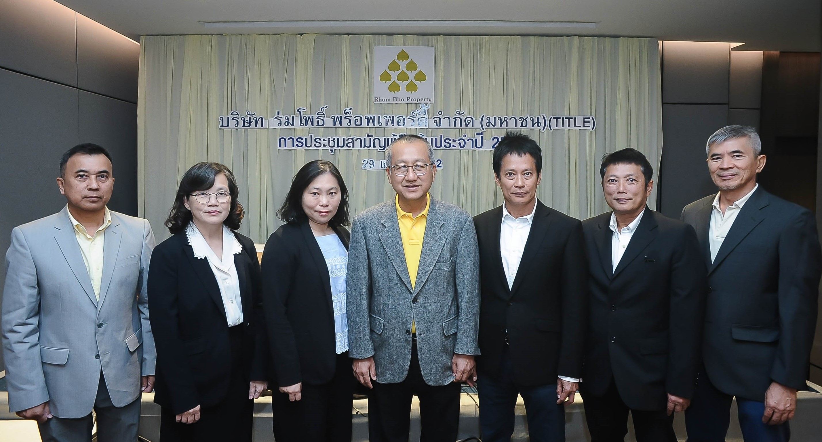 สุวิช ล่ำซำ (กลาง) ประธานกรรมการ, เด่นดนัย หุตะจูฑะ (ที่ 3 จากขวา) ประธานเจ้าหน้าที่บริหาร บริษัท ร่มโพธิ์ พร็อพเพอร์ตี้ ( TITLE ) พร้อมด้วยคณะกรรมการบริษัทฯ ถ่ายภาพร่วมกัน ภายหลังการประชุมสามัญผู้ถือหุ้นประจำปี 2562 มีมติอนุมัติการจ่ายเงินปันผลเป็นหุ้น อัตราหุ้นละ 0.25 บาท ให้แก่ผู้ถือหุ้นเดิม และจ่ายปันผลเป็นเงินสดหุ้นละ 0.027 บาท กำหนดจ่ายปันผลวันที่ 24 พ.ค. 2562