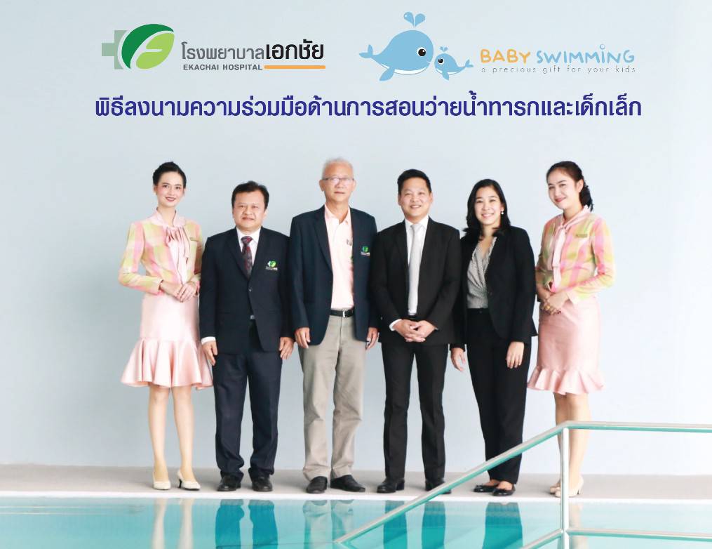 นพ.อำนาจ เอื้ออารีมิตร (ที่ 3 จากซ้าย) กรรมการและผู้อำนวยการ บริษัท เอกชัยการแพทย์ (EKH) และ พลภัทร นิติธรรมยง (ที่ 3 จากขวา) ผู้อำนวยการ โรงเรียนสอนว่ายน้ำสำหรับทารก และเด็กเล็ก ร่วมลงนามบันทึกข้อตกลงความร่วมมือ (MOU) ด้านการสอนว่ายน้ำทารก และเด็กเล็ก ซึ่งจะให้บริการ ณ อาคารกุมารเวช 5 ชั้น ภายในพื้นที่ของโรงพยาบาลเอกชัยการแพทย์ พร้อมรับสมัครเด็ก ๆ อายุ 4 เดือน – 3 ปี เพื่อเข้ามาเรียน โดยจะเปิดให้บริการเต็มรูปแบบในเดือนกันยายน 2562 นี้