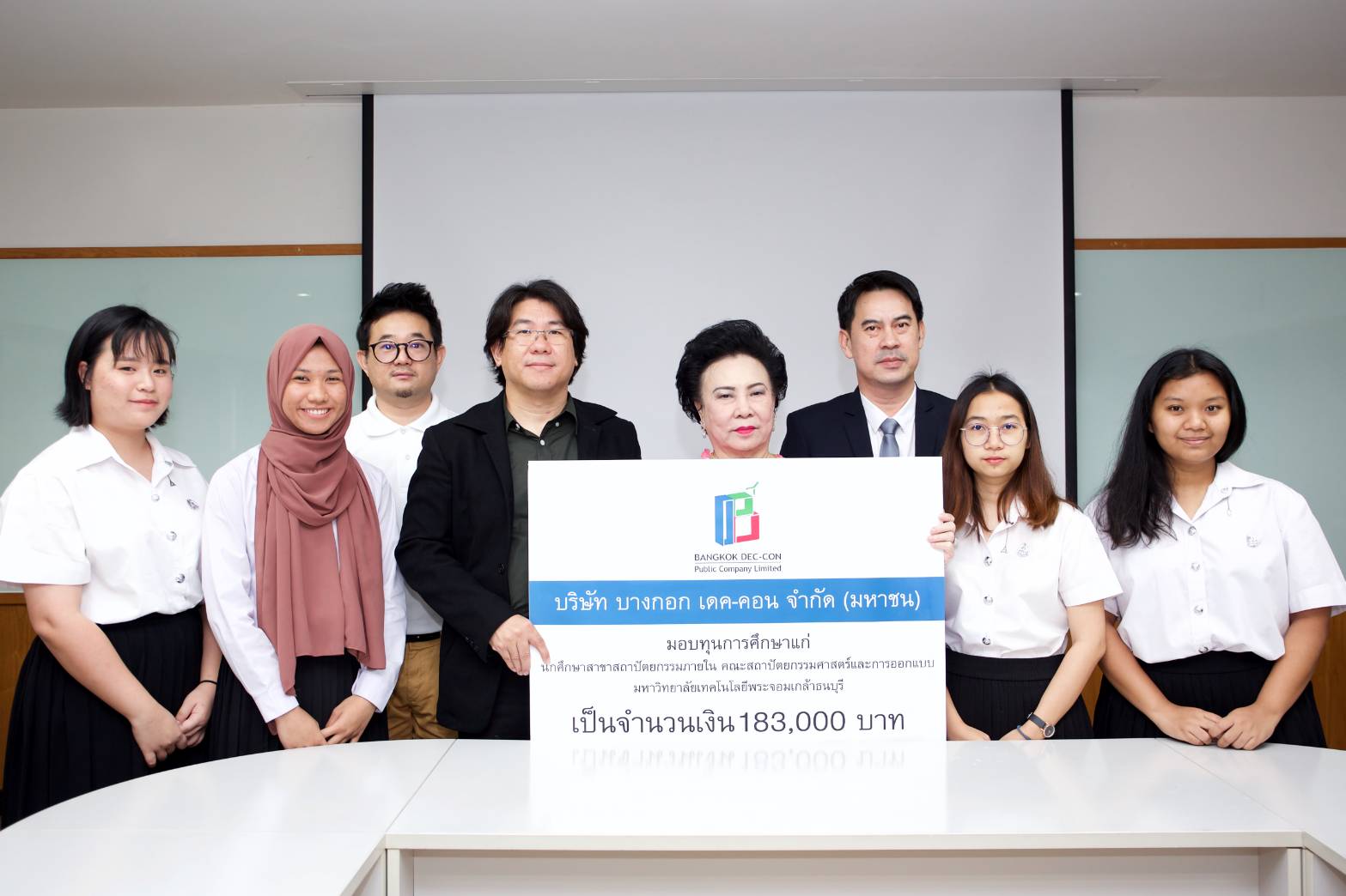 ธีระเมศฐ์ รัตนาสุวรรณชาติ (ที่ 3 ขวา ) รองกรรมการผู้จัดการ บริษัทบางกอกเดค-คอน ( BKD ) มอบทุนการศึกษาให้กับนักศึกษา สาขาสถาปัตยกรรมภายใน คณะสถาปัตยกรรมศาสตร์และการออกแบบ มหาวิทยาลัยเทคโนโลยี พระจอมเกล้าธนบุรี จำนวน 4 ทุน ต่อเนื่องจนกว่าจะจบการศึกษาระดับปริญญาตรี โดยมีอาจารย์ไมเคิลปริพล ตั้งตรงจิตร คณบดี คณะสถาปัตยกรรมศาสตร์และการออกแบบ เป็นผู้รับมอบทุน เมื่อวันที่ 12 พ.ย.2562 ที่ผ่านมา