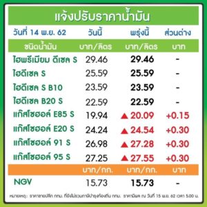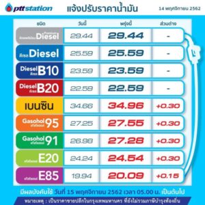 บริษัท ปตท.น้ำมันและการค้าปลีก (PTTOR) ในกลุ่มบริษัท ปตท. (PTT) และบริษัท บางจาก คอร์ปอเรชั่น (BCP) ประกาศปรับขึ้นราคาขายปลีกน้ำมันกลุ่มเบนซินและแก๊สโซฮอล์ทุกชนิด 30 สตางค์/ลิตร ยกเว้น E85 ปรับขึ้น 15 สตางค์/ลิตร ส่วนน้ำมันกลุ่มดีเซลทุกชนิด ราคาคงเดิม มีผลวันพรุ่งนี้ (15 พ.ย. 2562) ตั้งแต่เวลาตี 5 เป็นต้นไป