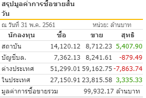 ภาพรวมการซื้อขายหุ้น วันที่ 31 พ.ค.2561 นักลงทุนต่างชาติขายสุทธิ 7,863.74 ล้านบาท บัญชีบริษัทหลักทรัพย์ขายสุทธิ 879.49 ล้านบาท ขณะที่สถาบันในประเทศซื้อสุทธิ 5,407.90 ล้านบาทและนักลงทุนในประเทศซื้อสุทธิ 3,335.33 ล้านบาท
