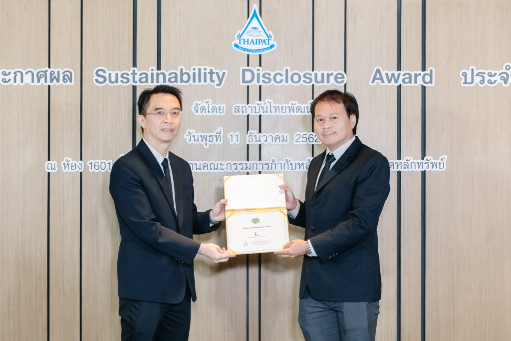 ภัทธชัย สนธิขันธ์ ผู้จัดการฝ่ายการพัฒนาที่ยั่งยืนด้านผู้คนและการพัฒนาชุมชน ไทยยูเนี่ยน รับมอบรางวัลเกียรติคุณ การเปิดเผยข้อมูลความยั่งยืน จากสถาบันไทยพัฒน์ และสำนักงานคณะกรรมการกำกับหลักทรัพย์และตลาดหลักทรัพย์แห่งประเทศไทย (ก.ล.ต.) สำหรับการรายงานด้านความยั่งยืนของบริษัท โดยดร. พิพัฒน์ ยอดพฤติการ ประธานสถาบันไทยพัฒน์ เป็นผู้มอบ