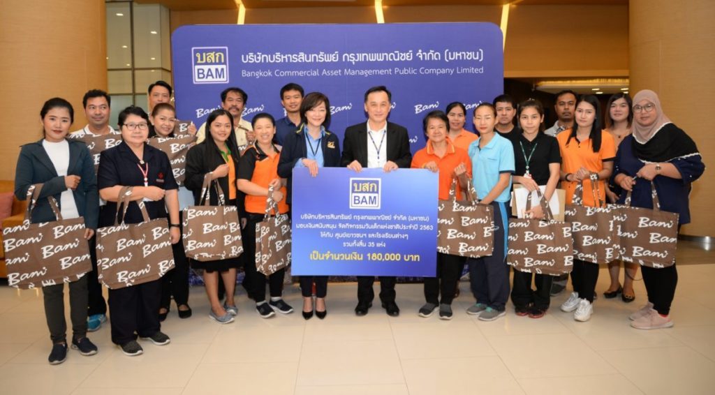 สมชาย ธนุรักษ์ไพโรจน์ รองกรรมการผู้จัดการใหญ่ และวิภาศิริ แสงวัชระกุล ผู้ช่วยกรรมการผู้จัดการใหญ่ บริษัทบริหารสินทรัพย์ กรุงเทพพาณิชย์ หรือ BAM มอบเงินสนับสนุนกิจกรรมวันเด็กแห่งชาติประจำปี 2563 ให้กับศูนย์เยาวชนฯ มูลนิธิ และโรงเรียนต่าง ๆ รวมทั้งสิ้น 35 แห่ง เป็นจำนวนเงิน 180,000 บาท ณ BAM สำนักงานใหญ่