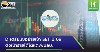 HoonSmart.com>>”เดนทัล คอร์ปอเรชั่น”(D) เตรียมขอย้ายเข้าเทรดในกระดาน SET ปี 69 หลังผลการดำเนินงานเติบโตต่อเนื่อง ตั้งเป้ารายได้ทั้งปีโตแตะพันล้านบาท ขณะที่งวด 9 เดือนแรกปีนี้ ทำรายได้รวมกว่า 773 ล้านบาท พร้อมตั้งเป้าขยายฐานนักลงทุนสถาบัน เพิ่มนักลงทุนรายย่อย