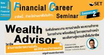 HoonSmart.com>> ตลาดหลักทรัพย์แห่งประเทศไทย ชวนนิสิตนักศึกษาที่สนใจวิชาชีพในตลาดทุนร่วมฟัง “Financial Career Seminar Season 2” ตอน วิชาชีพด้านการบริหารความมั่งคั่งและให้คำแนะนำการลงทุนแก่ลูกค้าของสถาบันการเงิน (Wealth Advisor) มาทำความรู้จักวิชาชีพ Wealth Advisor รับฟังประสบการณ์และเคล็ดลับการทำงาน พร้อมร่วมกิจกรรม ลุ้นรับรางวัลมากมาย พบกัน 3 หัวข้อ