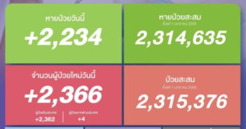 HoonSmart.com>> ศบค.เผยยอดติดเชื้อโควิดรายใหม่เพิ่มขึ้น 2,366 ราย หายป่วยกลับบ้าน 2,234 ราย เสียชีวิต 20 ราย ยอดติดเชื้อเข้าข่าย/ATK 3,843 ราย