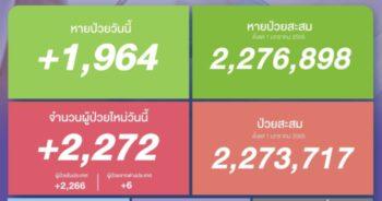 HoonSmart.com>> ศบค. เผยยอดติดเชื้อโควิด-19 รายใหม่เพิ่มขึ้น 2,272 ราย หายป่วยกลับบ้าน 1,964 ราย เสียชีวิต 23 ราย ยอดติดเชื้อเข้าข่าย/ATK 3,071 ราย