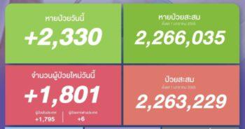 HoonSmart.com>> ศบค. เผยยอดติดเชื้อโควิด-19 รายใหม่เพิ่มขึ้น 1,801 ราย หายป่วยกลับบ้าน 2,330 ราย เสียชีวิต 15 ราย ยอดติดเชื้อเข้าข่าย/ATK 1,984 ราย