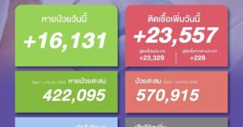 HoonSmart.com>> ศบค.เผยผู้ติดเชื้อโควิดรายใหม่วันนี้พุ่ง 23,557 ราย เดินทางมาจากต่างประเทศ 228 ราย ยอดหายป่วยกลับบ้าน 16,131 ราย เสียชีวิตเพิ่ม 38 ราย