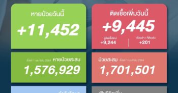 HoonSmart.com>> ศบค.พบผู้ติดเชื้อโควิดรายใหม่เพิ่ม 9,445 ราย หายป่วยกลับบ้าน 11,452 ราย เสียชีวิต 60 ราย