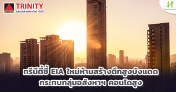 HoonSmart.com>> บล.ทรีนีตี้ ประเมินเกณฑ์ EIA ห้ามสร้างตึกสูง ใหญ่บังแดด บังลม ทั่วไทย ด้านชุมชุมมีสิทธิ์สั่งห้ามขึ้นโครงการ เฮียริ่ง 18 มิ.ย.นี้ กระทบกลุ่มอสังหาฯ คอนโดขนาดใหญ่ทำยากขึ้น กรณีอยู่ระหว่างขอ EIA อาจต้องปรับแแบบใหม่ คาด ANAN, LPN, SPALI และ AP กระทบมากสุด เหตุเตรียมเปิดตัวโครงการใหม่คอนโดสูงมาก