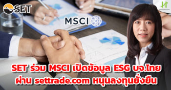 HoonSmart.com>> ตลาดหลักทรัพย์ฯ ร่วม MSCI ผู้ให้บริการด้านการลงทุนครบวงจรของโลก เผยแพร่ข้อมูลด้านความยั่งยืนของ บจ. ไทยผ่านเว็บไซต์ www.settrade.com เพื่อให้ผู้ลงทุนได้รับข้อมูลที่หลากหลายในแหล่งเดียว เผยผู้สนใจเข้าดูข้อมูล ESG ไทยกว่า 3 แสนเพจวิว สัญญาณดีผู้ลงทุนเริ่มให้ความสำคัญการลงทุนอย่างยั่งยืนมากขึ้น