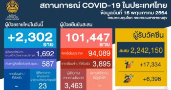 HoonSmart.com>> ศบค.เผยผู้ติดเชื้อรายใหม่เพิ่ม 2,302ราย ผู้ติดเชื้อใหม่จากระบบเฝ้าระวัง 1,692 ราย จากการค้นหาเชิงรุก 587 ราย ยอดผู้ป่วยสะสมทะลุ 101,447 ราย มีผู้ป่วยอาการหนัก 1,228 คน เสียชีวิต 24 ราย ด้านสถานการณ์โลกมีผู้ติดเชื้อ 163.16 ล้านราย