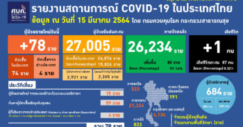HoonSmart.com>> ศบค. เผยพบผู้ติดเชื้อโควิด-19 รายใหม่เพิ่ม 78 ราย ติดเชื้อจากระบบเฝ้าระวัง และบริการ 15 ราย ตรวจเชิงรุก 59 ราย เดินทางจากต่างประเทศ 4 ราย มีผู้ติดเชื้อเสียชีวิตเพิ่ม 1 ราย ส่วนผู้ติดเชื้อทั่วโลกกว่า 120.41 ล้านราย