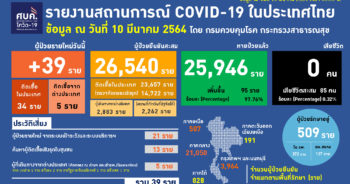 HoonSmart.com>> ศบค. เผยพบผู้ติดเชื้อโควิด-19 รายใหม่เพิ่ม 39 ราย ติดเชื้อจากระบบเฝ้าระวัง และบริการ 21 ราย ตรวจเชิงรุก 13 ราย เดินทางจากต่างประเทศ 5 ราย ส่วนผู้ติดเชื้อทั่วโลกกว่า 118.15 ล้านราย