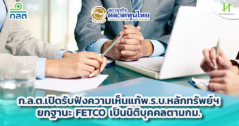 HoonSmart.com>> ก.ล.ต. เปิดรับฟังความคิดเห็น แก้ไขพ.ร.บ.หลักทรัพย์ฯ เพื่อกำหนดให้สภาธุรกิจตลาดทุนไทย (FETCO) มีสถานะเป็นนิติบุคคลตามกฎหมาย เพื่อส่งเสริมและสนับสนุนการพัฒนาธุรกิจตลาดทุนให้เติบโตต่อเนื่องอย่างยั่งยืน