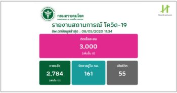 HoonSmart.com>> ผู้ติดเชื้อโควิด-19 รายใหม่เพิ่ม 8 ราย ยอดสะสม 3,000 ราย ชี้ 5 รายเป็นต่างด้าวที่ศูนย์กักกัน สงขลา ด้านผู้เสียชีวิตไม่มีเพิ่ม ยอดสะสม 55 ราย