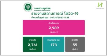 HoonSmart.com>> ผู้ติดเชื้อโควิด-19 รายใหม่เพิ่ม 1 ราย ยอดสะสม 2,989 ราย เสียชีวิตเพิ่ม 1 ราย