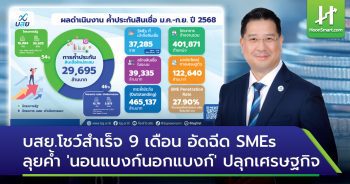 HoonSmart.com>>บรรษัทประกันสินเชื่ออุตสาหกรรมขนาดย่อม (บสย.) เปิดความสำเร็จ ในช่วง 9 เดือนปี’68 มียอดค้ำประกันสินเชื่อรวม 29,695 ล้านบาท ก่อให้เกิดมูลค่าทางเศรษฐกิจกว่า 122,640 ล้านบาท ช่วย SMEs ได้รับสินเชื่อเพิ่มขึ้นกว่า 37,285 ราย ร่วมขับเคลื่อนเศรษฐกิจตามนโยบายรัฐบาล เติมสภาพคล่องรองรับช่วงไฮซีซันเทศกาลท่องเที่ยวปลายปี ขยายวงค้ำ”นอนแบงก์”นอกกลุ่มสถาบันการเงิน