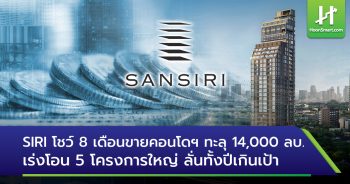 HoonSmart.com>>”แสนสิริ” (SIRI) อวดความสำเร็จยอดขายคอนโดมิเนียม 8 เดือน 14,000 ล้านบาท เติบโต 40% เทียบกับช่วงเดียวกันของปีก่อน จากความสำเร็จกลยุทธ์ Strategic Location มั่นใจยอดขายทั้งปีทะลุเป้า 19,000 ล้านบาท ครองอันดับ 1 ผู้นำตลาด