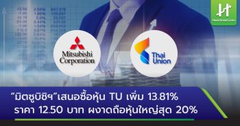 HoonSmart.com>>”ไทยยูเนี่ยน กรุ๊ป” (TU) แจ้ง” “มิตซูบิชิ คอร์ปอเรชั่น”จะเข้าซื้อหุ้นเพิ่มอีก 532.27 ล้านหุ้น คิดเป็น 13.81% ในราคา 12.50 บาท/หุ้น หวังเก็บหุ้นให้ได้ 20% จากสิ้นก.ค.ถือจำนวน 6.19% (ไม่รวมหุ้นซื้อคืนที่บริษัทถือ) ด้านหุ้น TU อยู่ที่ 11.40 บาท (-3.39%)